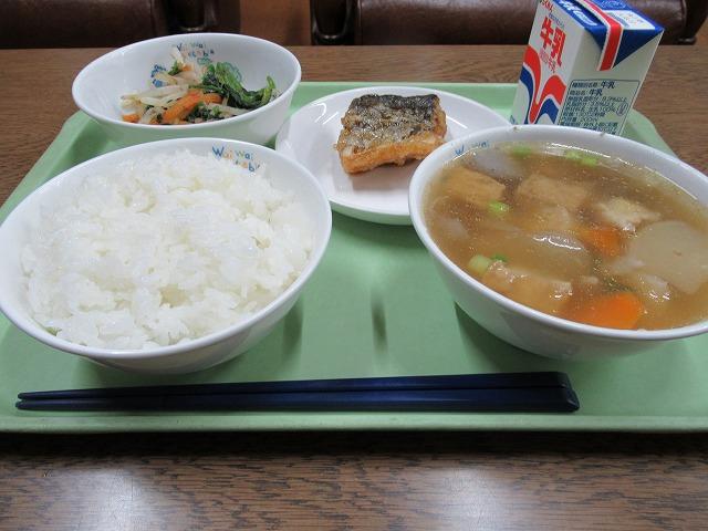 今日の献立は、ごはん、牛乳、鰆のレモン煮、ほうれん草ともやしのおひたし、けんちん汁です。