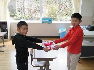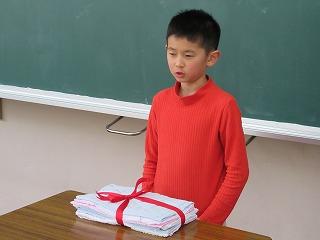 卒業する結月くんが、新くんと協力して雑巾を縫って、在校生にプレゼントしました。