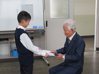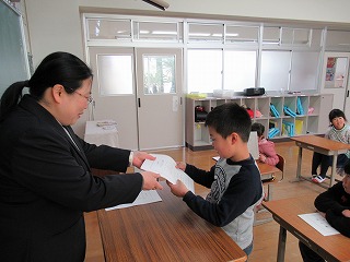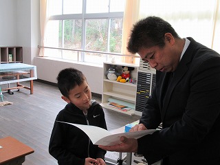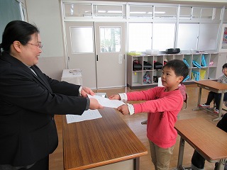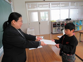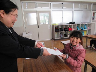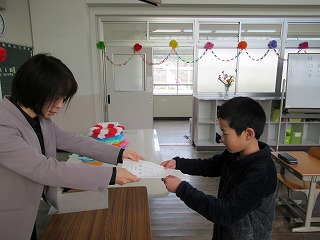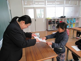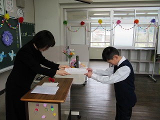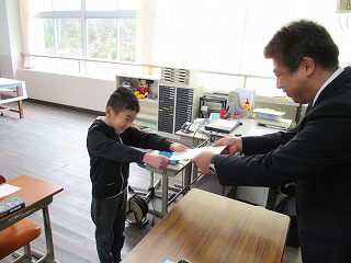 最後の学級活動です。それぞれ担任の先生から通信簿をもらいました。