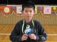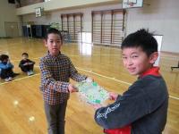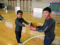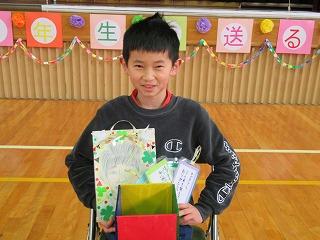 そして、みんなから卒業生に手作りのプレゼントを渡しました。低学年は栞、4年生は小物入れ、5年生は似顔絵です。