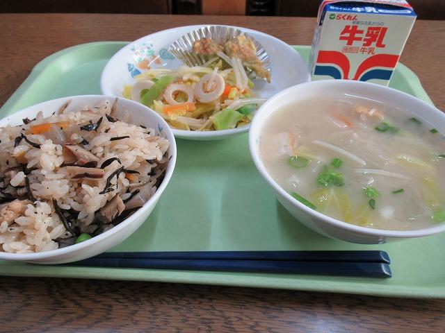 2019年3月13日 12時10分今日の献立は、ひじきごはん、牛乳、チーズ入りちくわの磯辺揚げ、もやしのごまずあえ、キャベツのみそ汁です。