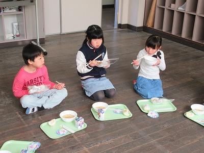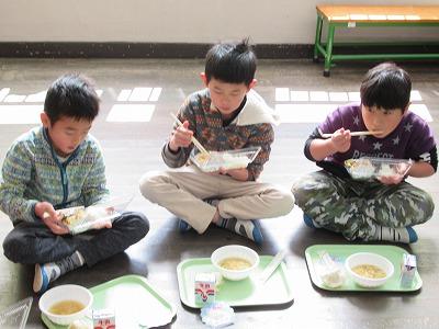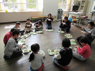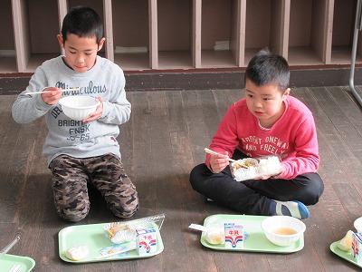 教室で 2019年3月14日 12時30分 今日はお弁当給食なので、結月くんの希望から、いつも生活している自教室でみんなで食べました。毎日一緒にランチルームで食べていますが、教室で輪になって食べるのもいいですね。一つ一つが思い出になっていくことでしょう。