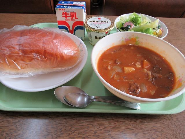 今日の献立は、バターパン、牛乳、ビーフシチュー、フレンチサラダ、ヨーグルトです。